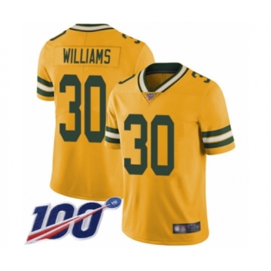 >Men's Green Bay Packers #30 Jamaal Williams Limited Gold Rush Vapor Untouchable 100th Season Football Jersey