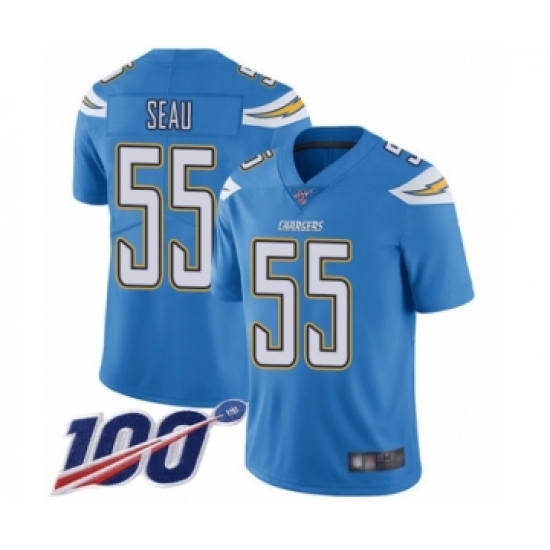 >Men's Los Angeles Chargers #55 Junior Seau Electric Blue Alternate Vapor Untouchable Limited Player 100th Season Football Jersey
