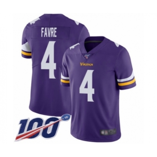 Men's Minnesota Vikings #4 Brett Favre Purple Team Color Vapor Untouchable Limited Player 100th Season Football Jersey