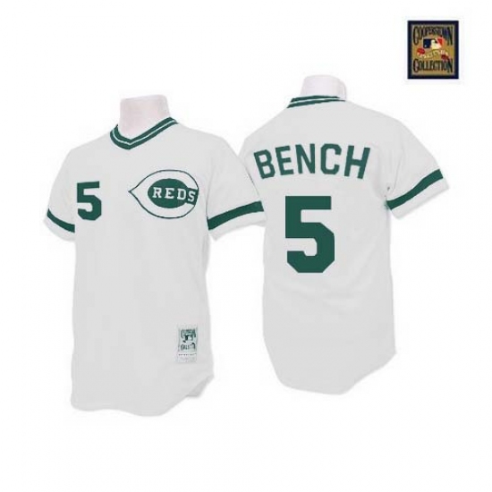 Home>MLB>Cincinnati Reds>Johnny Bench>Men's Mitchell and Ness Cincinnati Reds #5 Johnny Bench Replica White(Green Patch) Throwback MLB Jersey