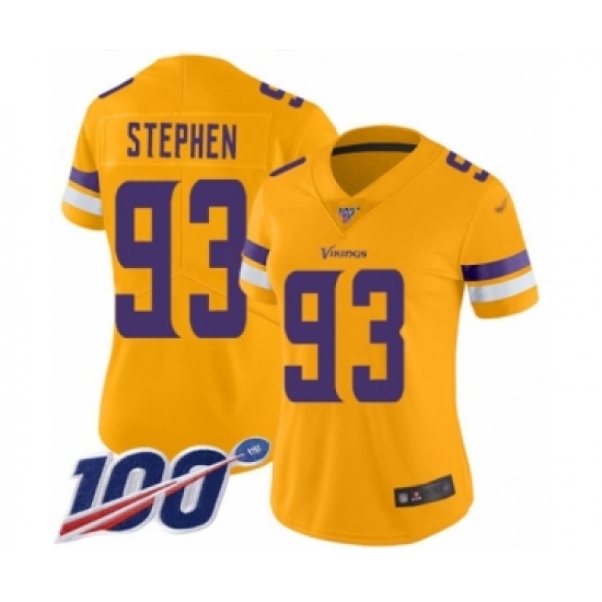 >Women's Minnesota Vikings #93 Shamar Stephen Limited Gold Inverted Legend 100th Season Football Jersey