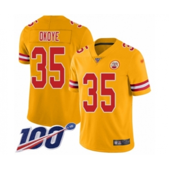 >Youth Kansas City Chiefs #35 Christian Okoye Limited Gold Inverted Legend 100th Season Football Jersey