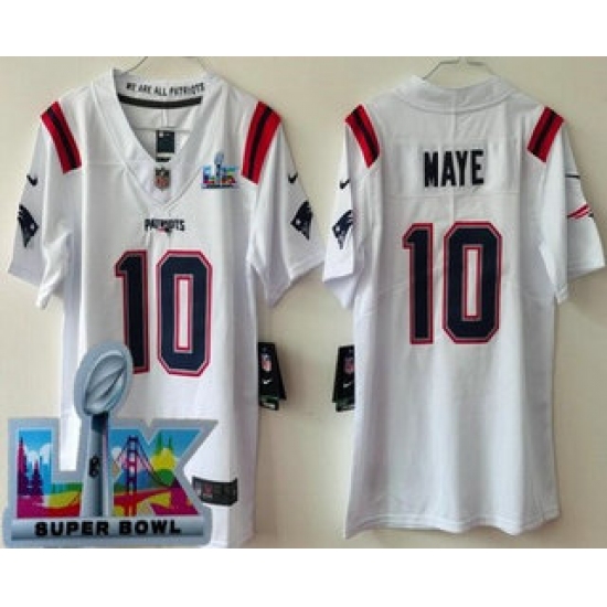 >Youth New England Patriots #10 Drake Maye Limited White Super Bowl LX Vapor Jersey