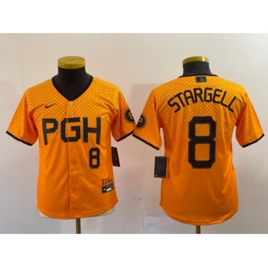 Youth Nike Pittsburgh Pirates #8 Willie Stargell Number Yellow 2023 City Connect Stitched Jersey2