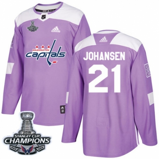>Men's Adidas Washington Capitals #21 Lucas Johansen Authentic Purple Fights Cancer Practice 2018 Stanley Cup Final Champions NHL Jersey