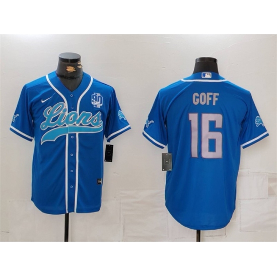 >Men's Detroit Lions #16 Jared Goff Blue With 90th Anniversary Cool Base Stitched Baseball Jersey