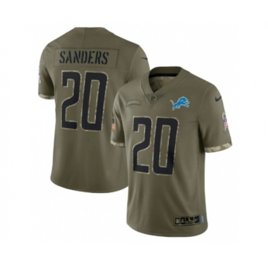 >Men's Detroit Lions #20 Barry Sanders 2022 Olive Salute To Service Limited Stitched Jersey