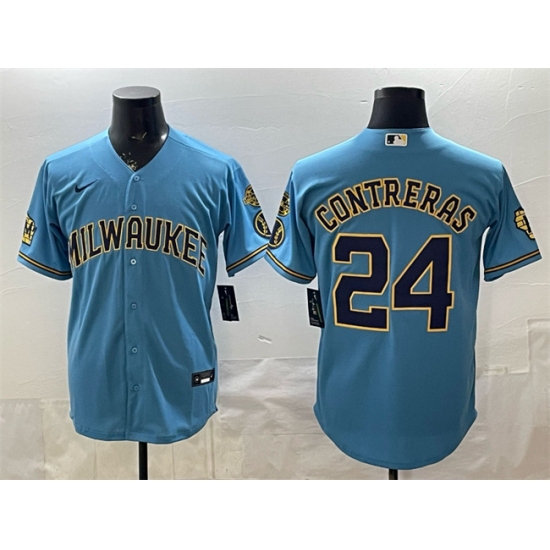 >Men's Milwaukee Brewers #24 William Contreras Blue With Home & Bob Uecker Stitched Baseball Jersey