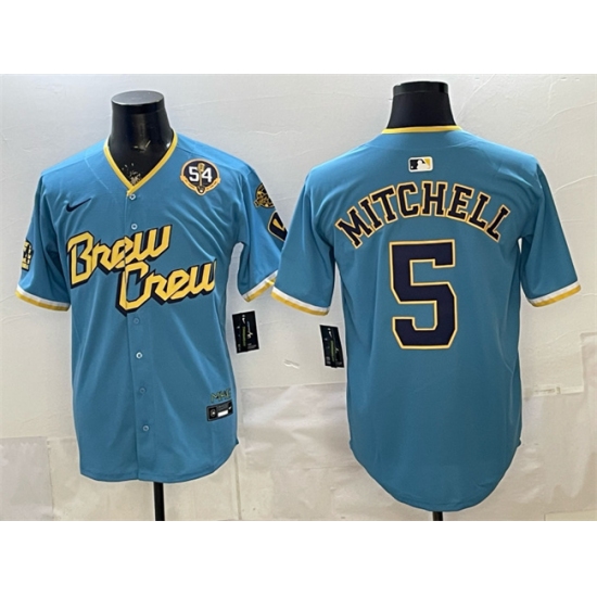 Men's Milwaukee Brewers #5 Garrett Mitchell Powder Blue City Connect With Home & Bob Uecker Limited Stitched Baseball Jersey