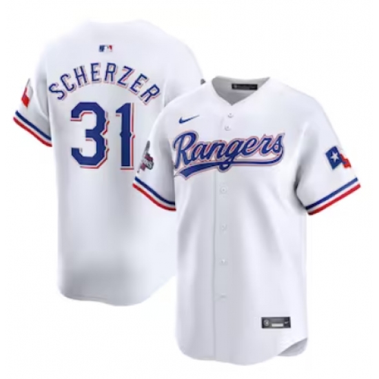 Men's Texas Rangers #31 Max Scherzer Nike White Home 2023 World Series Champions Limited Jersey