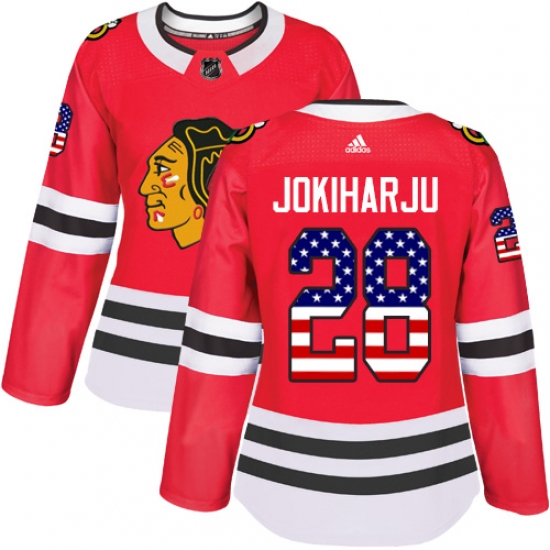 Home>NHL>Chicago Blackhawks>Henri Jokiharju>Women's Adidas Chicago Blackhawks #28 Henri Jokiharju Authentic Red USA Flag Fashion NHL Jersey