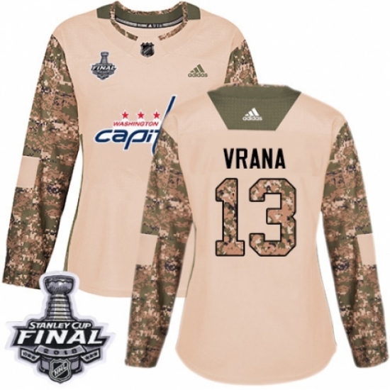 >Women's Adidas Washington Capitals #13 Jakub Vrana Authentic Camo Veterans Day Practice 2018 Stanley Cup Final NHL Jersey