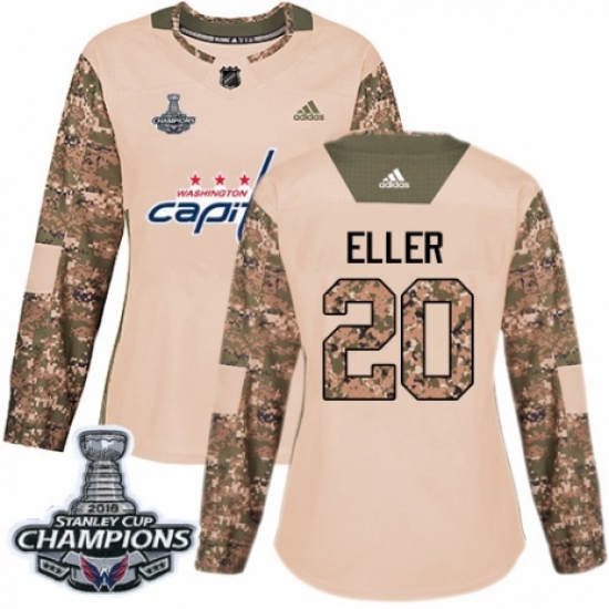 >Women's Adidas Washington Capitals #20 Lars Eller Authentic Camo Veterans Day Practice 2018 Stanley Cup Final Champions NHL Jersey