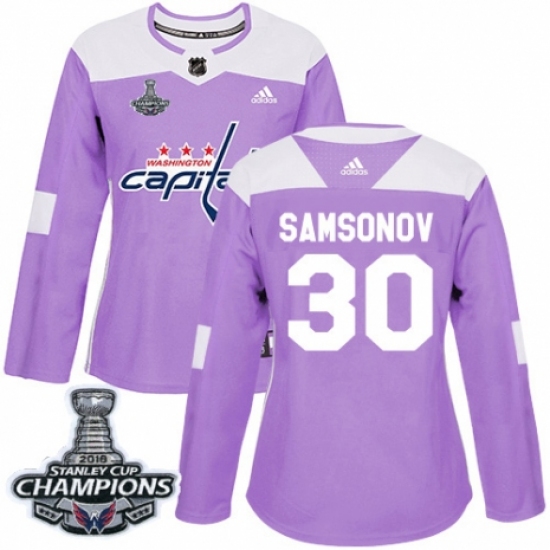 >Women's Adidas Washington Capitals #30 Ilya Samsonov Authentic Purple Fights Cancer Practice 2018 Stanley Cup Final Champions NHL Jersey