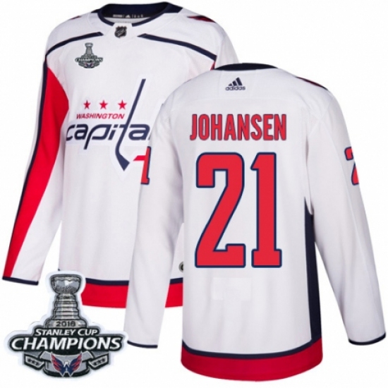>Youth Adidas Washington Capitals #21 Lucas Johansen Authentic White Away 2018 Stanley Cup Final Champions NHL Jersey