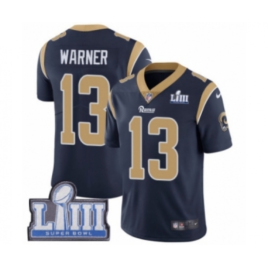 >Youth Nike Los Angeles Rams #13 Kurt Warner Navy Blue Team Color Vapor Untouchable Limited Player Super Bowl LIII Bound NFL Jersey